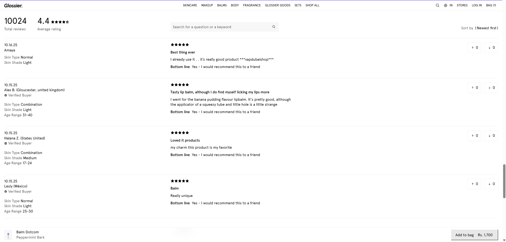 Glossier’s product pages feel like a community. Each product has real user images, ratings, and comments. It’s authentic, relatable, and builds emotional connection.